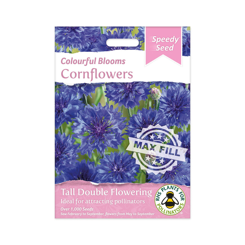 Create a stunning display of colourful, pollinator-friendly blooms with Speedy Seed Max-Fill Cornflower Tall Double Mix.